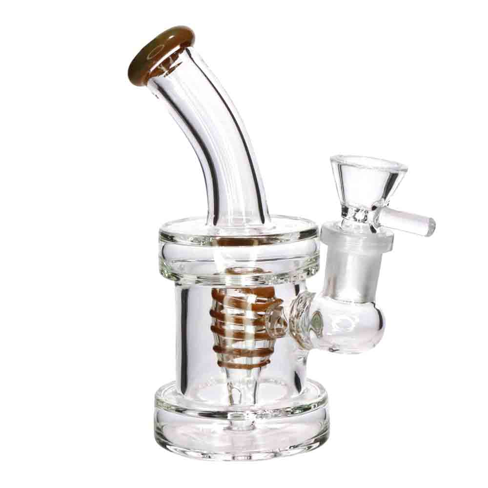 Despite its compact 5-inch height, it provides excellent diffusion and cooling — perfect for customers who want big function from a portable piece. Each rig includes a color-accented spiral perc and angled mouthpiece to reduce splashback while adding a touch of personality to every shelf.
