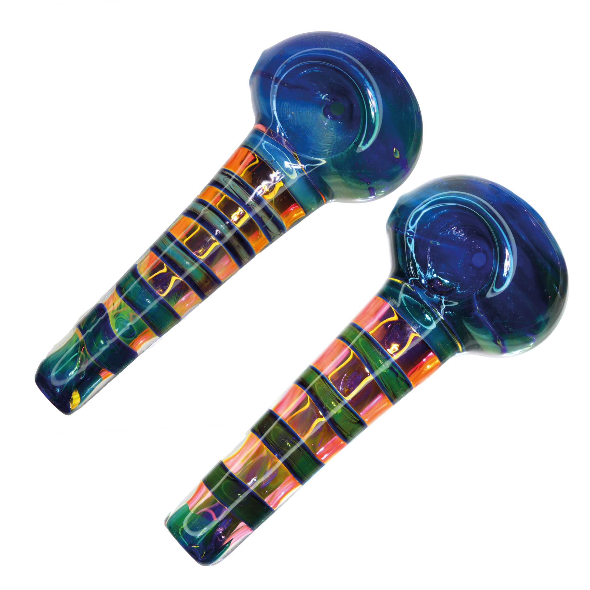 This 5.5-inch fumed glass spoon hand pipe features a striking layered color-band design combined with deep blue fumed glass bowls. The color fuming reacts to heat and use, subtly shifting tones over time, giving customers a piece that evolves with use.