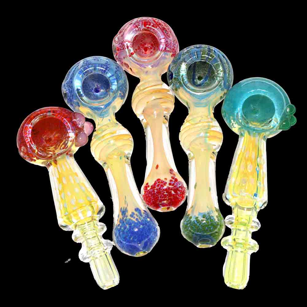 Upgrade your wholesale glass selection with our 4.5-inch Glass Hand Pipe Spoons, available at $3.95 each. These premium spoons feature artistic designs with colorful dotted accents and swirl patterns, giving each piece a unique, eye-catching look that your customers will appreciate.